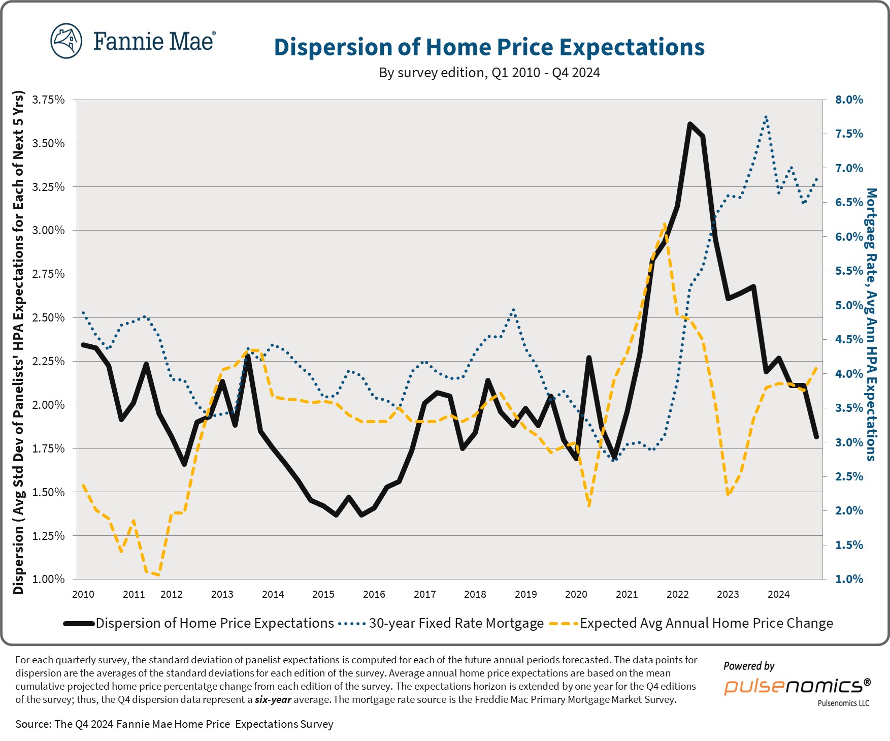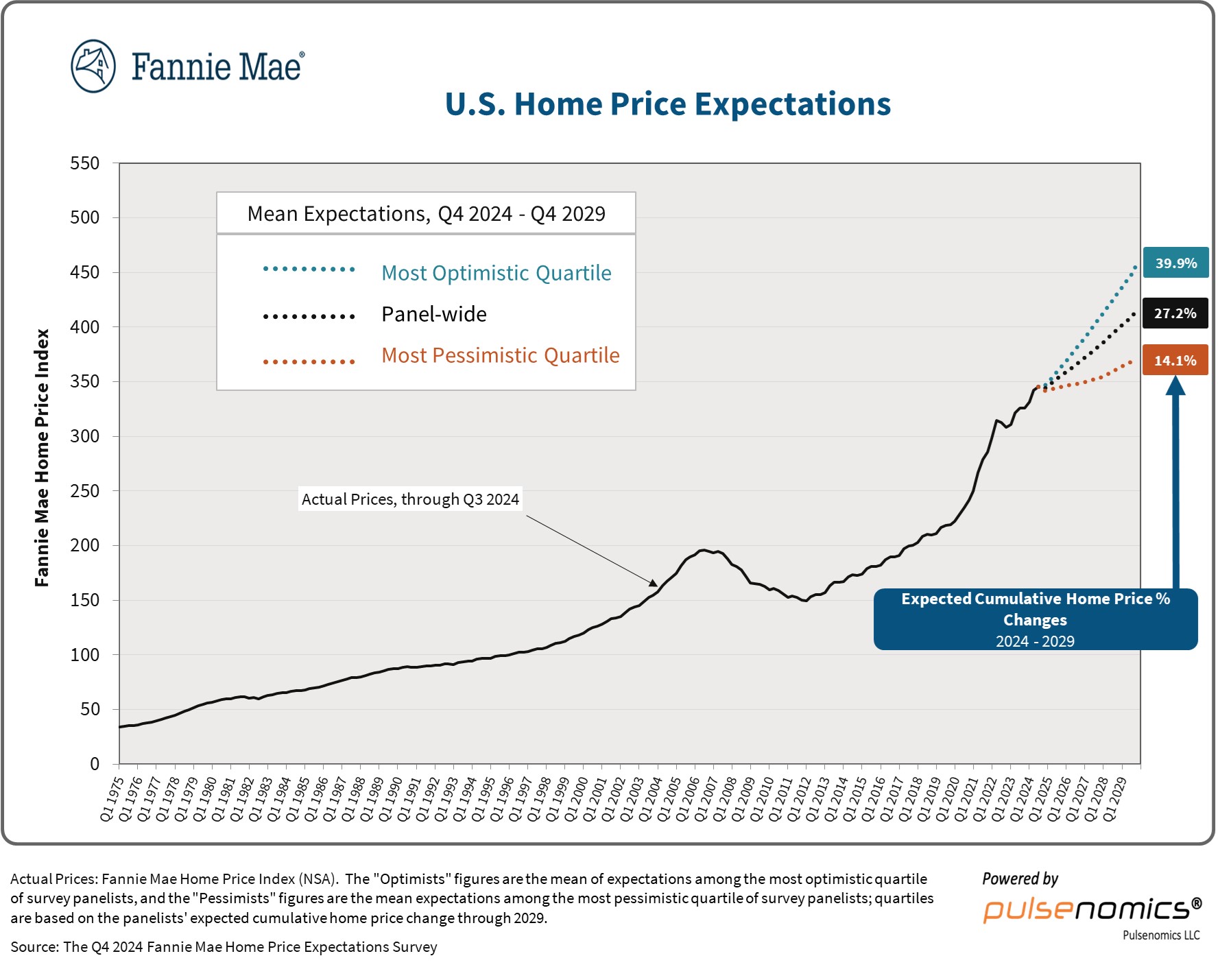 Fannie Mae's Home Price Expectations Survey (HPES), produced in partnership with Pulsenomics, LLC, polls over 100 housing experts across the industry and academia for forecasts of national home price percentage changes in each of the coming five calendar years, with the Fannie Mae Home Price Index as the benchmark. On a quarterly basis, Fannie Mae will publish the latest panelist-level expectations, as well as a special topic report that includes respondent feedback on topical questions designed to help inform the broader housing industry.