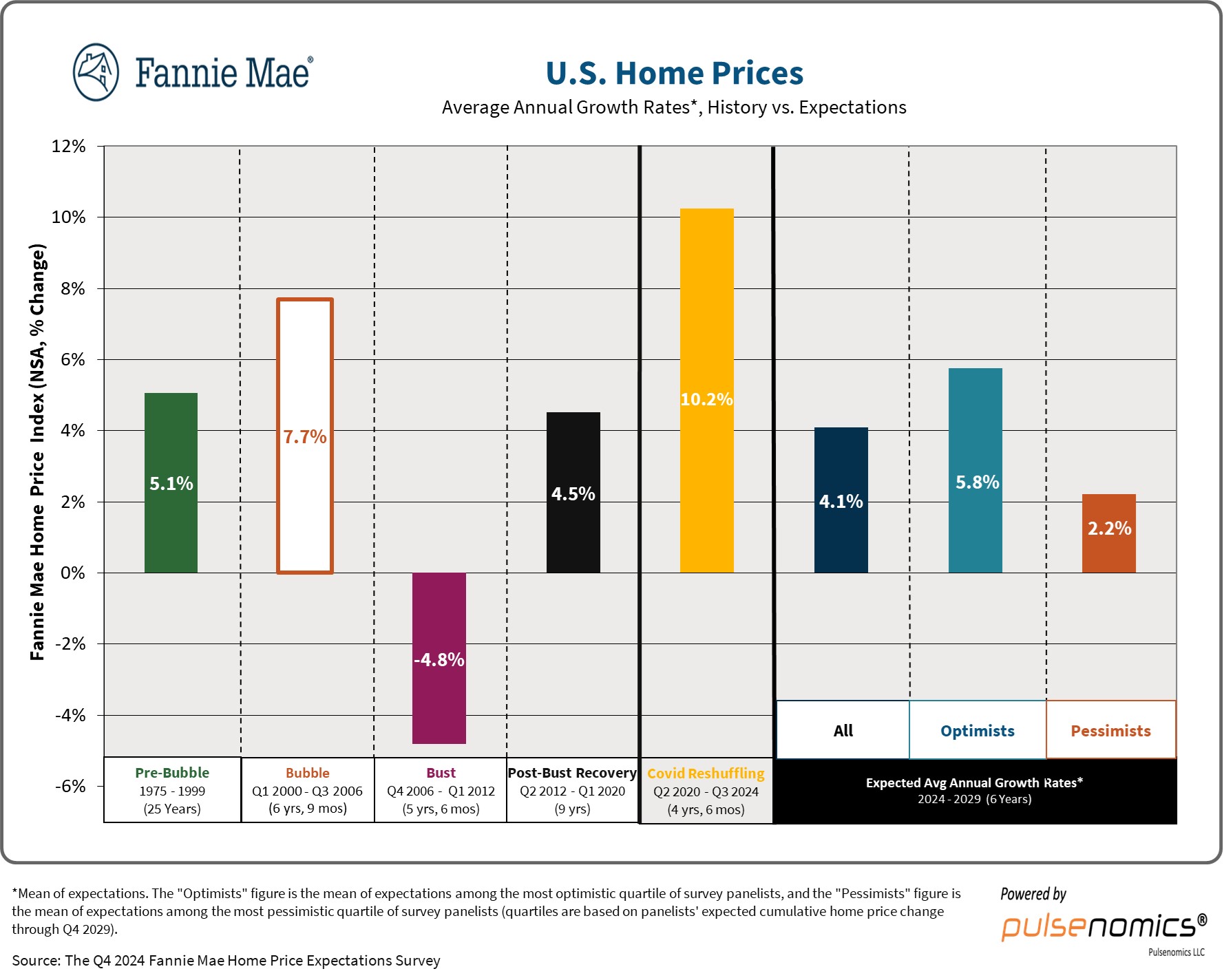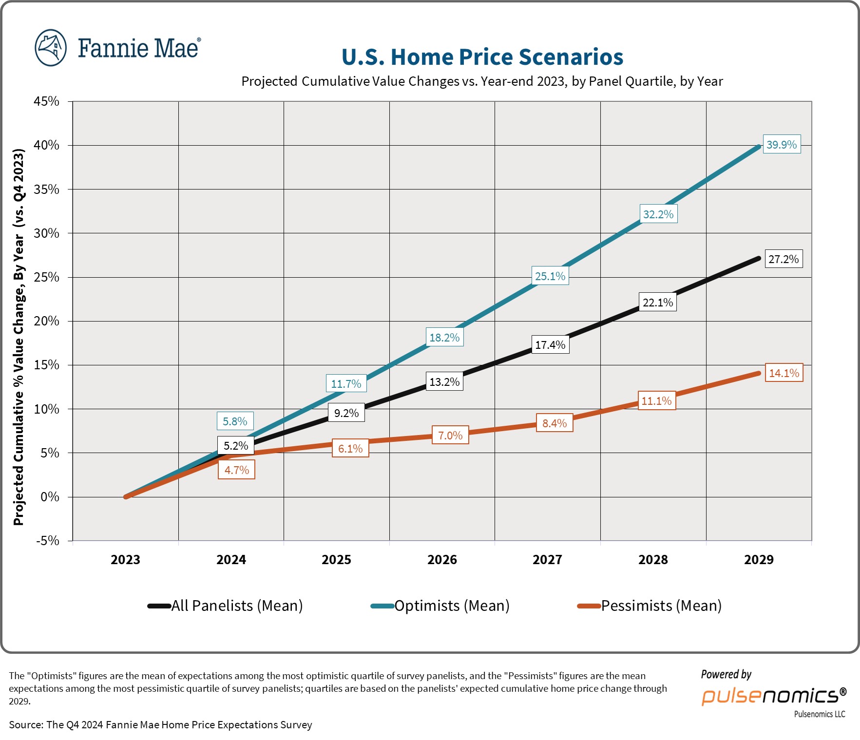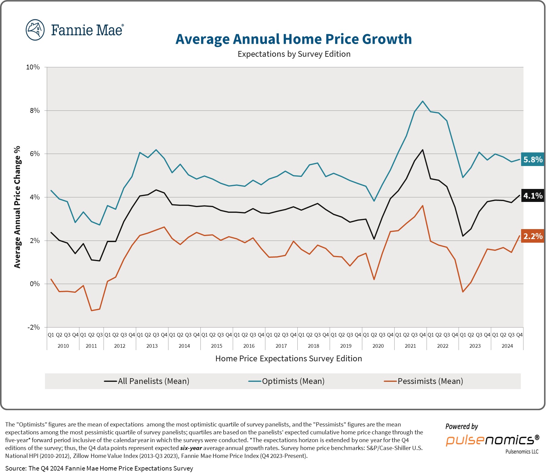 The information in this report was collected from third parties and compiled by Pulsenomics LLC. Panelists’ expectations do not necessarily represent those of their affiliated organizations or employers. Opinions, analyses, estimates, forecasts, and other views of the surveyed experts should not be construed as indicating Fannie Mae’s business prospects or expected results, are based on a number of assumptions, and are subject to change without notice. How this information affects Fannie Mae will depend on many factors. Neither Pulsenomics nor Fannie Mae makes any representations as to the accuracy or completeness of the information contained herein and has no obligation to update, modify or amend this report or to otherwise notify a recipient thereof in the event that any forecast or estimate set forth herein changes or subsequently becomes inaccurate. This report is provided for informational purposes only. It is not an offer or a solicitation of an offer to buy or sell any financial instruments. If this report is reproduced, distributed or published by any third party for any purpose, Pulsenomics LLC must be noted as the source within any such third party reproduction or publication.